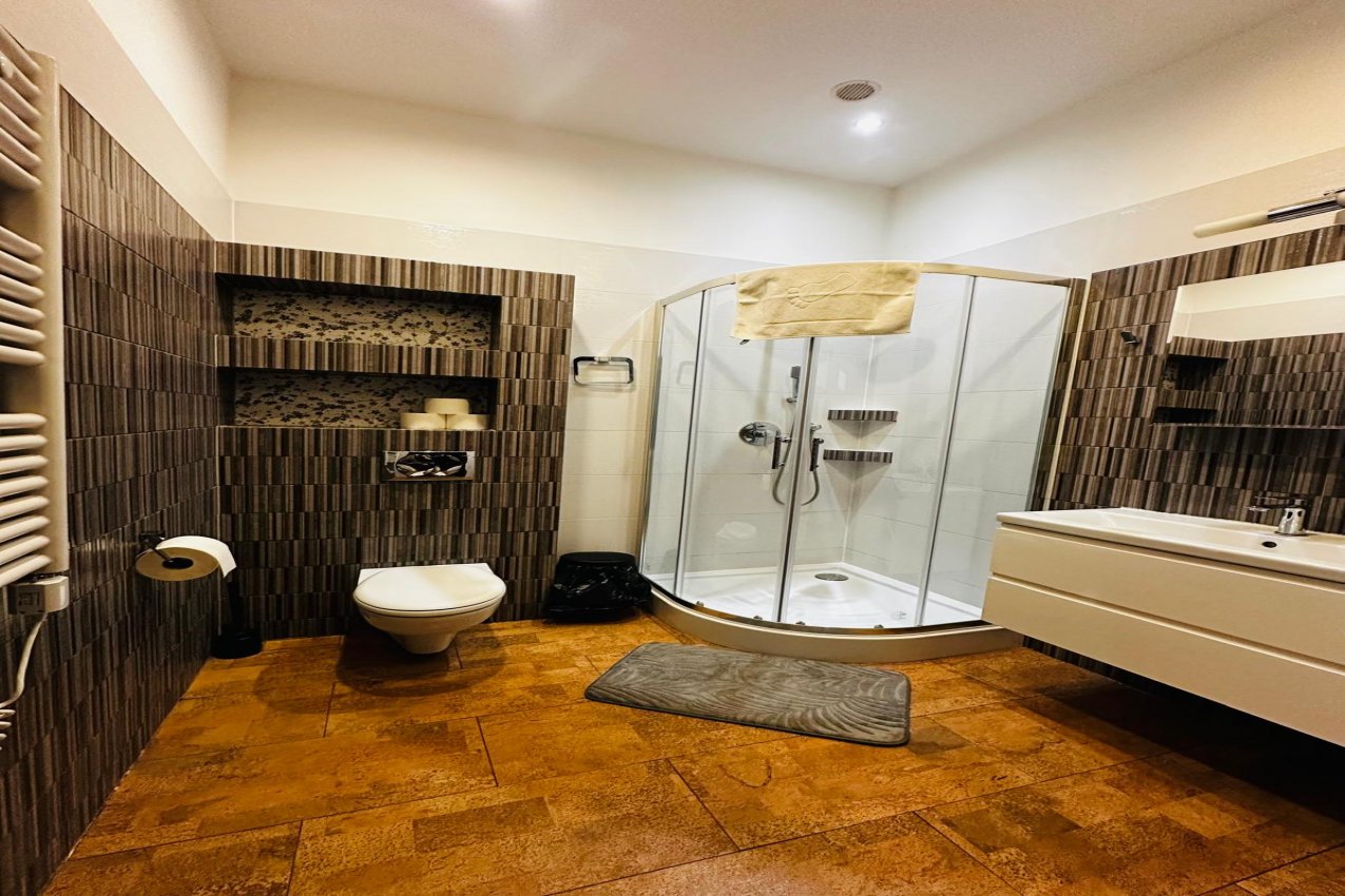 Shower, WC, Washbasin, Hair dryer, Washing machine, Soap, Towels